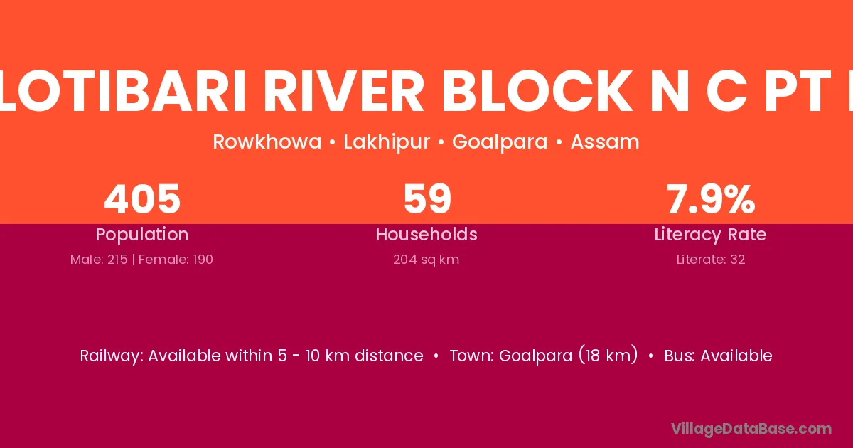 Goalpara (18 km) is the nearest town to Lotibari River Block N C Pt I village for major economic activities and is located approximately 18 km away.