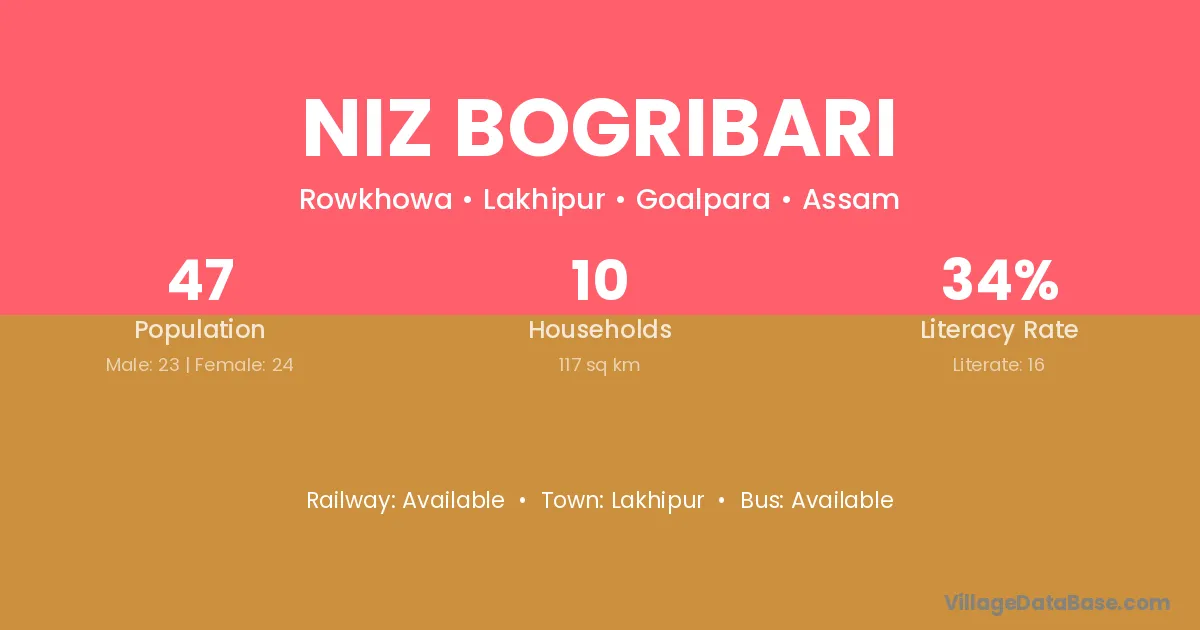 The literacy rate of Niz Bogribari village is 34.04%. Male literacy stands at 30.43% and female literacy at 37.50%.