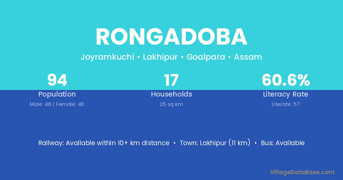 Lakhipur (11 km) is the nearest town to Rongadoba village for major economic activities and is located approximately 11 km away.