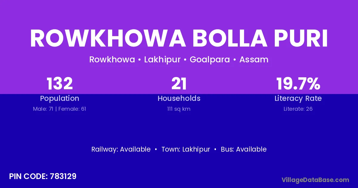 Rowkhowa Bolla Puri village has a total population of 132 people, of which 71 are males and 61 are females.
