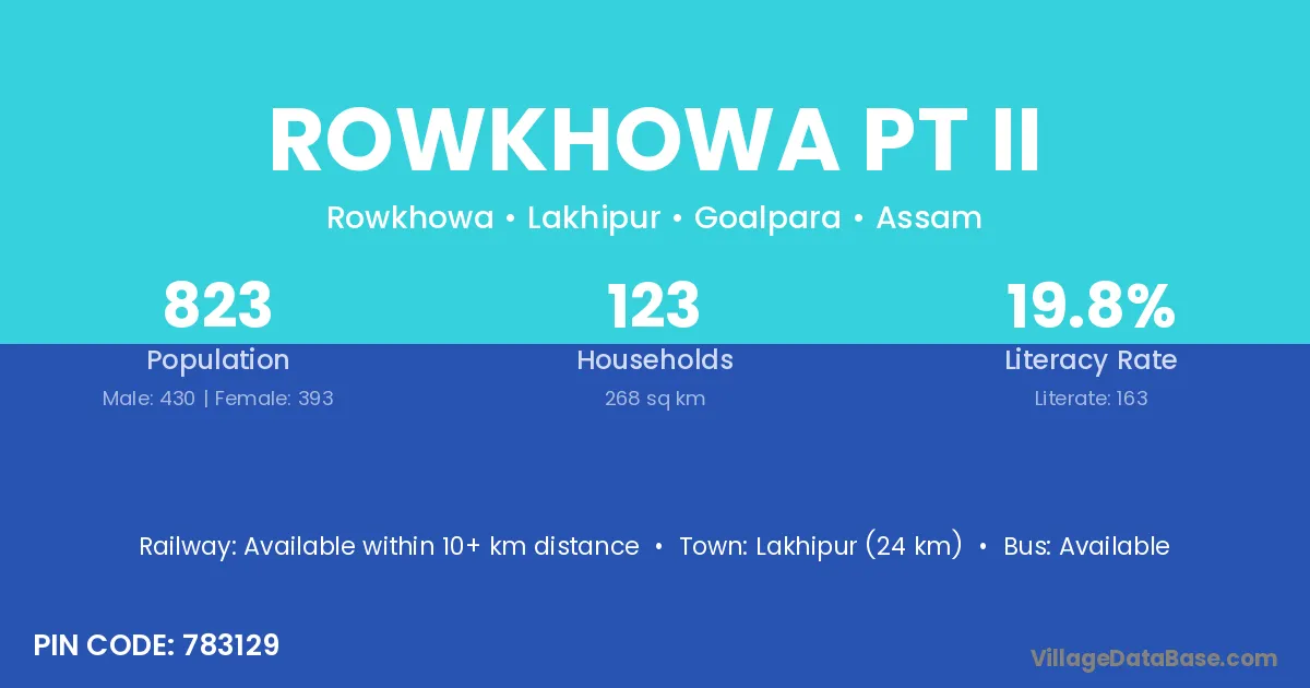 Lakhipur (24 km) is the nearest town to Rowkhowa Pt Ii village for major economic activities and is located approximately 24 km away.