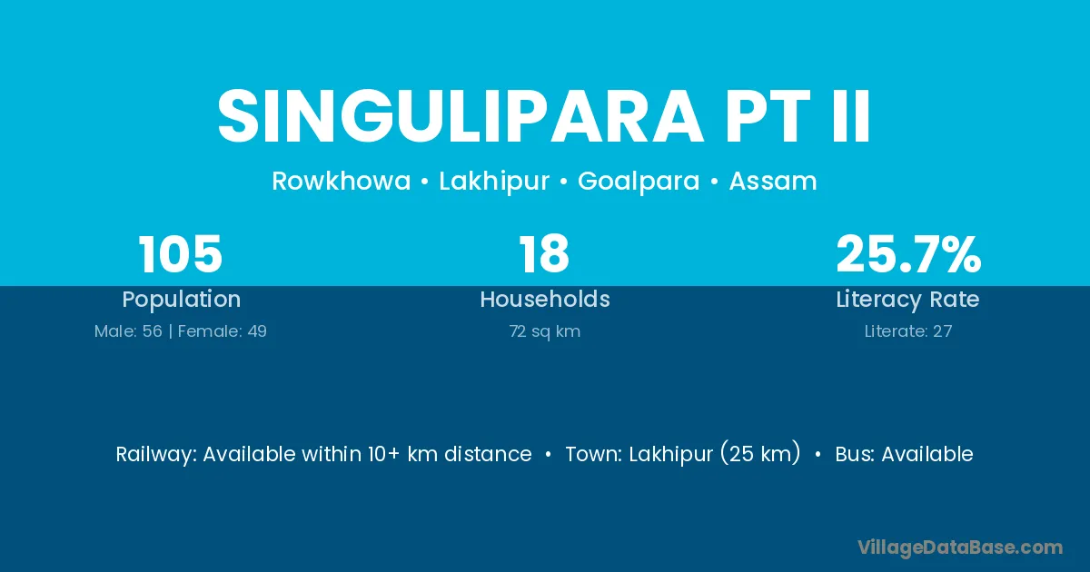 Lakhipur (25 km) is the nearest town to Singulipara Pt Ii village for major economic activities and is located approximately 25 km away.