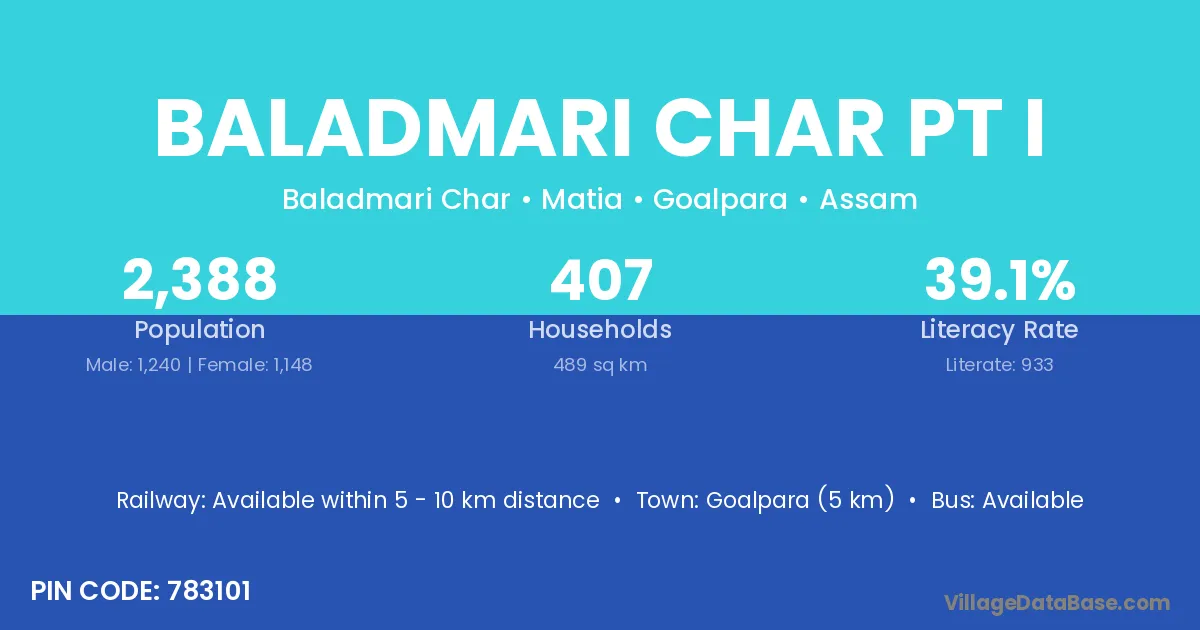 Goalpara (5 km) is the nearest town to Baladmari Char Pt I village for major economic activities and is located approximately 5 km away.