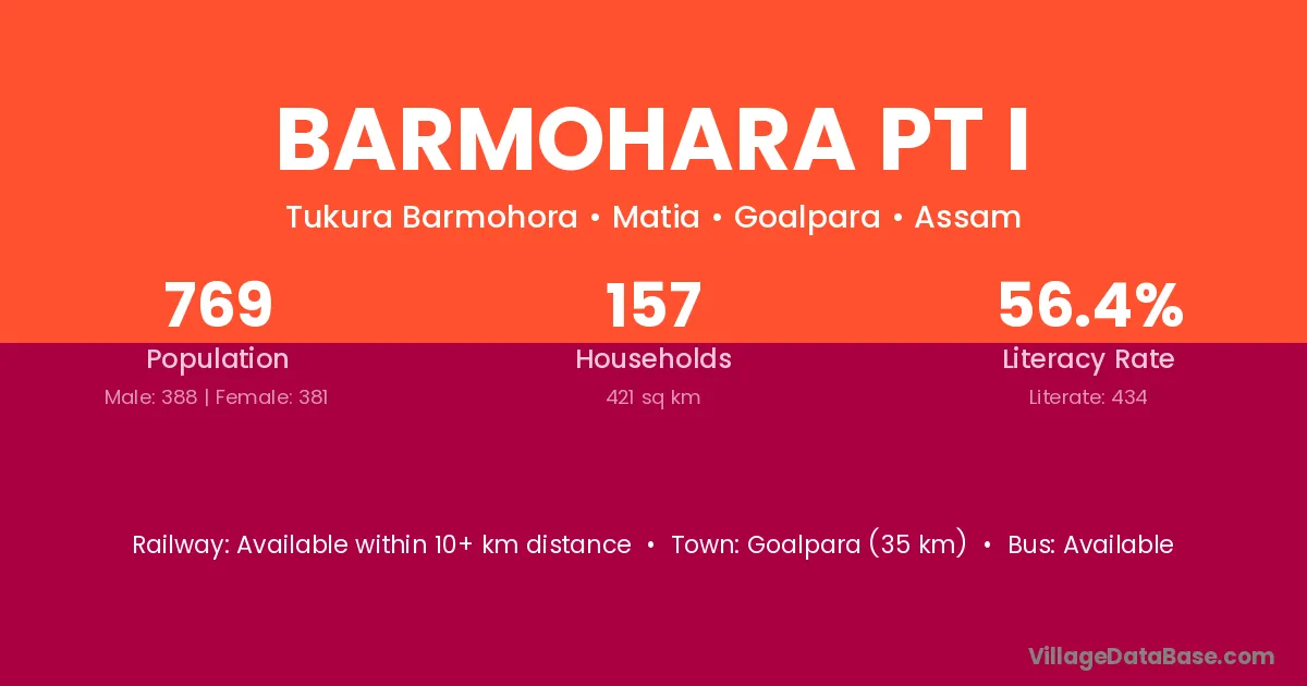 Goalpara (35 km) is the nearest town to Barmohara Pt I village for major economic activities and is located approximately 35 km away.