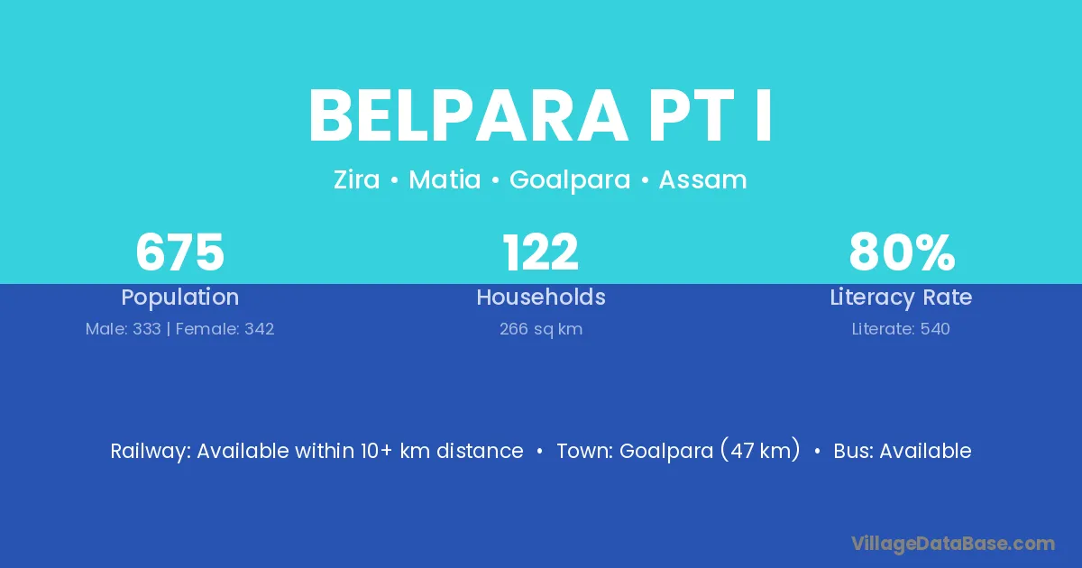 Goalpara (47 km) is the nearest town to Belpara Pt I village for major economic activities and is located approximately 47 km away.
