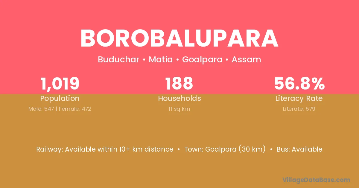 Goalpara (30 km) is the nearest town to Borobalupara village for major economic activities and is located approximately 30 km away.