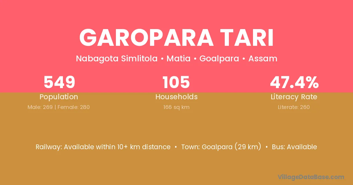 Goalpara (29 km) is the nearest town to Garopara Tari village for major economic activities and is located approximately 29 km away.