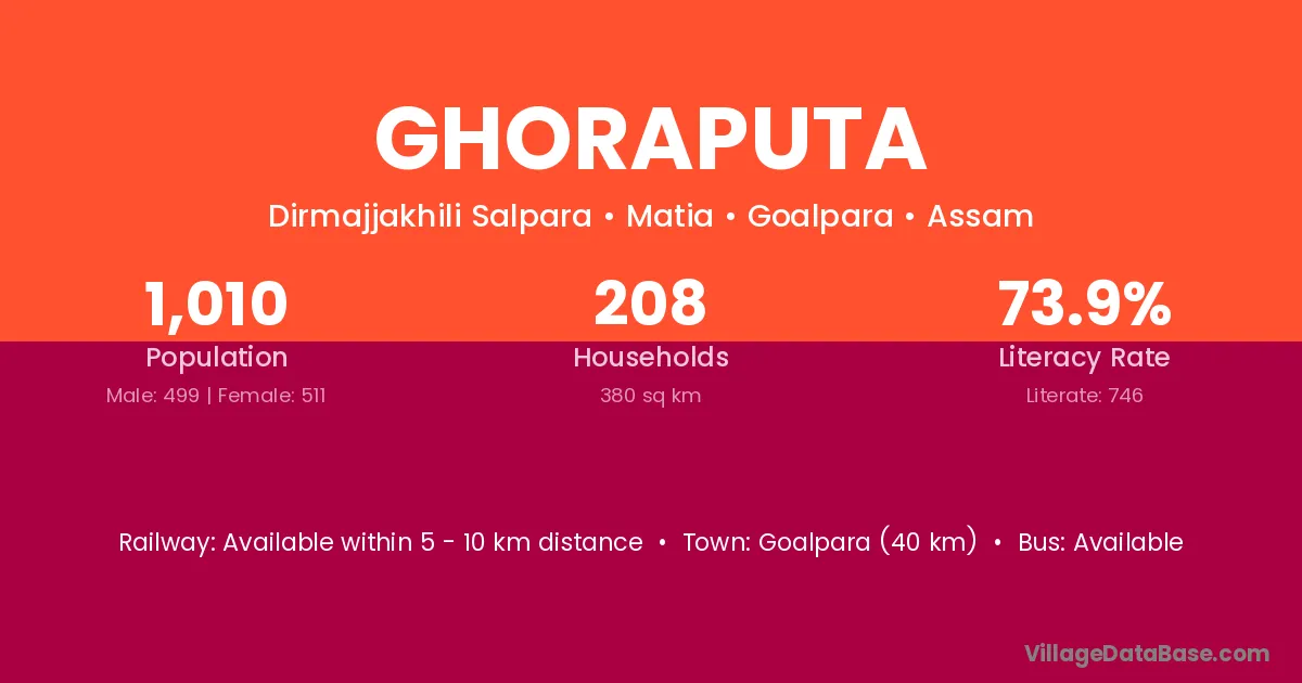 Ghoraputa village has a total population of 1,010 people, of which 499 are males and 511 are females.