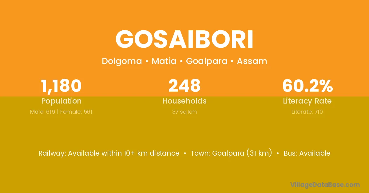 Goalpara (31 km) is the nearest town to Gosaibori village for major economic activities and is located approximately 31 km away.