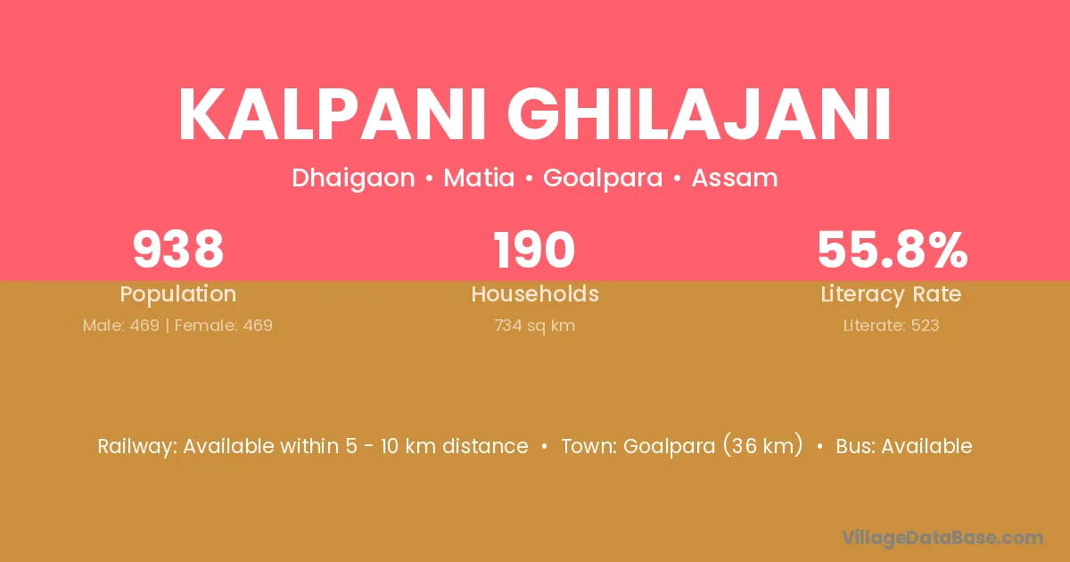 Goalpara (36 km) is the nearest town to Kalpani Ghilajani village for major economic activities and is located approximately 36 km away.
