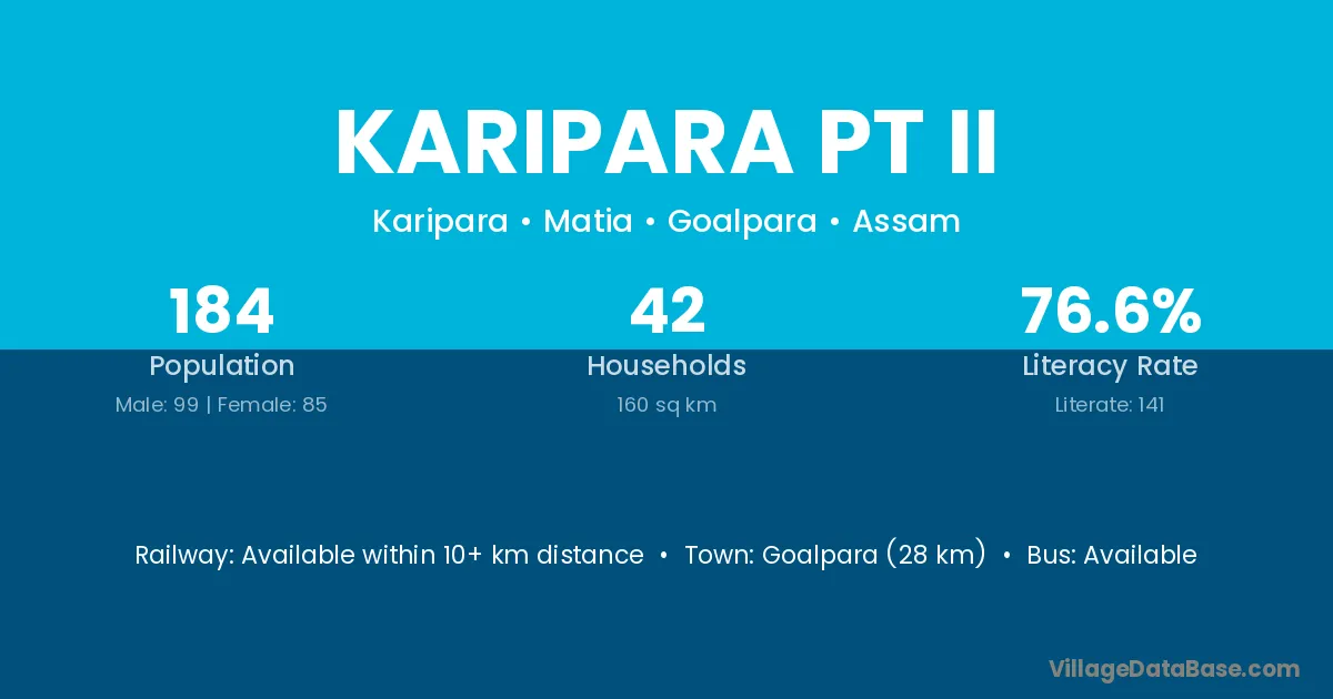 Karipara Pt Ii village has a total population of 184 people, of which 99 are males and 85 are females.