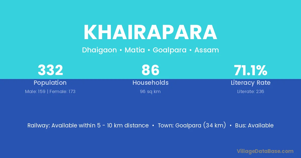 Goalpara (34 km) is the nearest town to Khairapara village for major economic activities and is located approximately 34 km away.