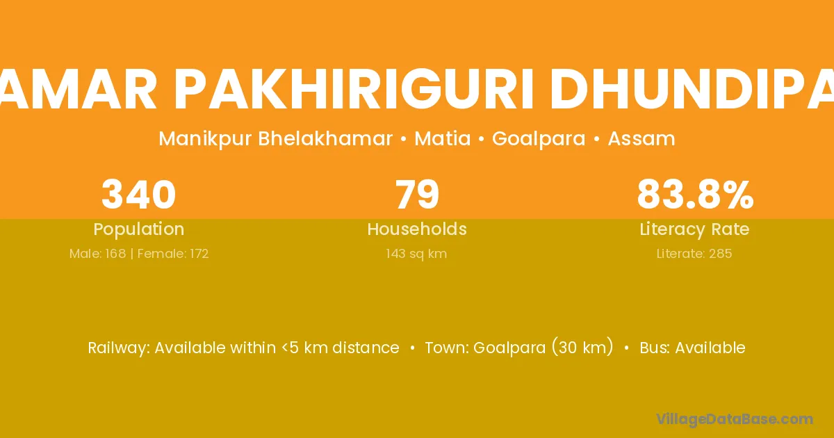 Khamar Pakhiriguri Dhundipara village has a total population of 340 people, of which 168 are males and 172 are females.