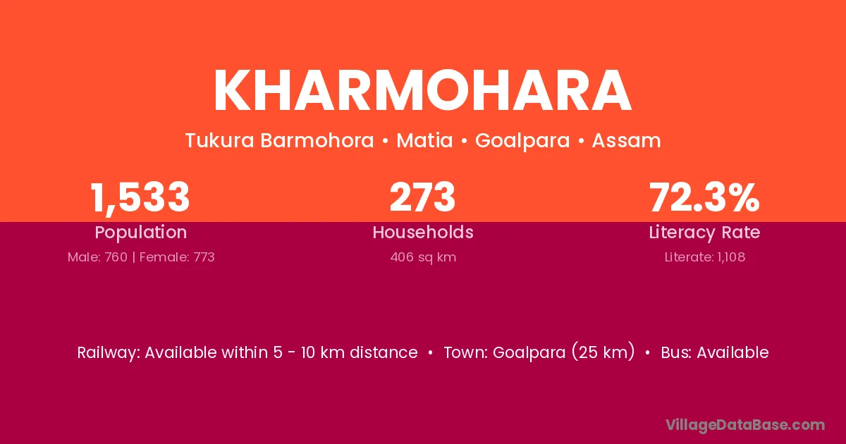 Goalpara (25 km) is the nearest town to Kharmohara village for major economic activities and is located approximately 25 km away.