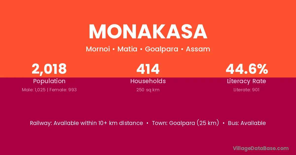 Goalpara (25 km) is the nearest town to Monakasa village for major economic activities and is located approximately 25 km away.