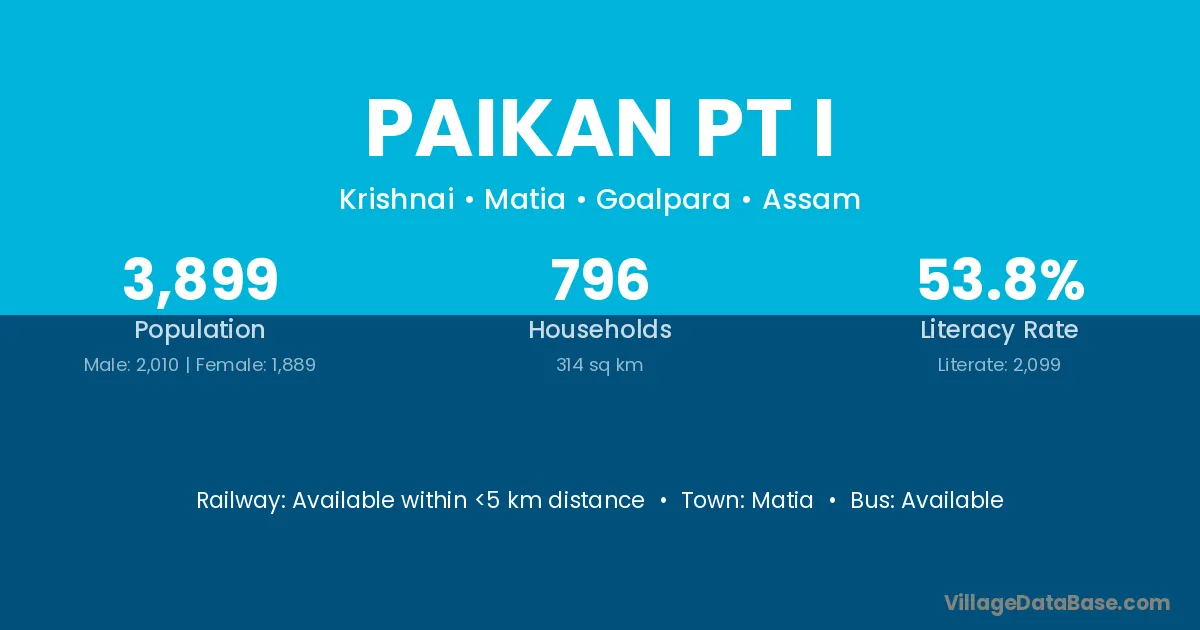 Paikan Pt I village has a total population of 3,899 people, of which 2,010 are males and 1,889 are females.