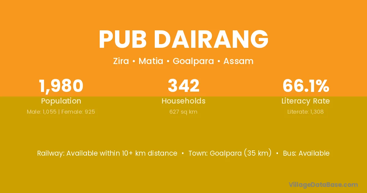 Pub Dairang village has a total population of 1,980 people, of which 1,055 are males and 925 are females.