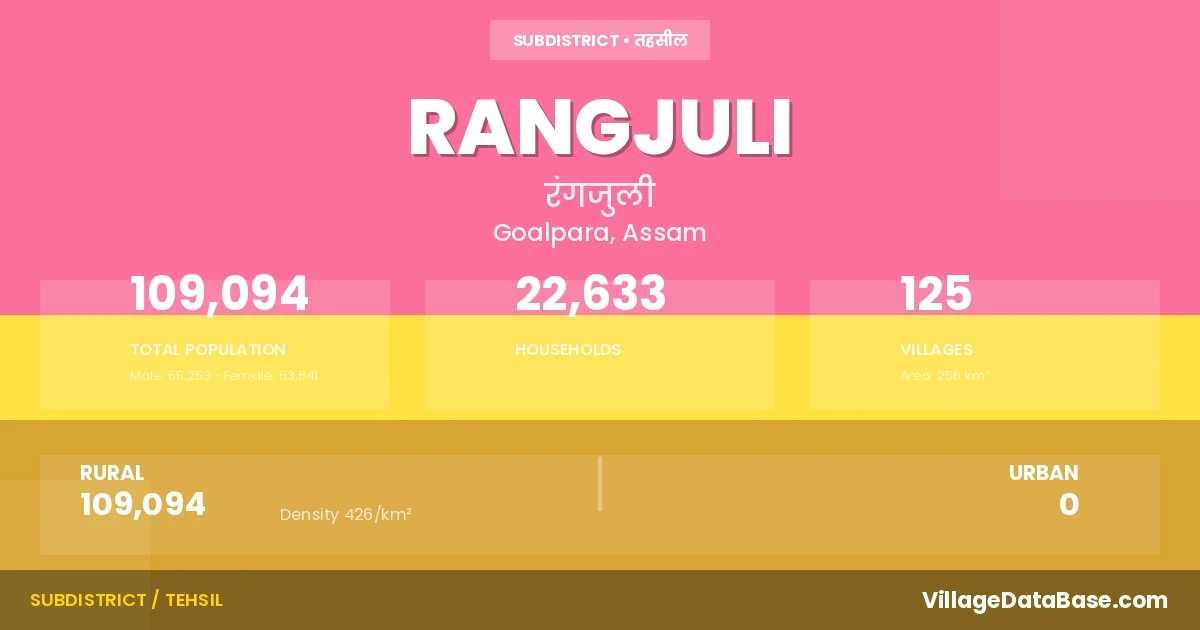 Rangjuli is a town and Subdivision in the Goalpara district of the Assam. In India, a Subdivision is a subdivision of a district responsible for the administration and revenue collection of a specific area within the district. Subdivisions play a crucial role in the local governance structure, contributing significantly to the development and administration of their communities.