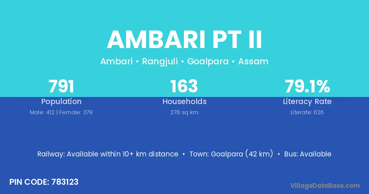 Goalpara (42 km) is the nearest town to Ambari Pt Ii village for major economic activities and is located approximately 42 km away.