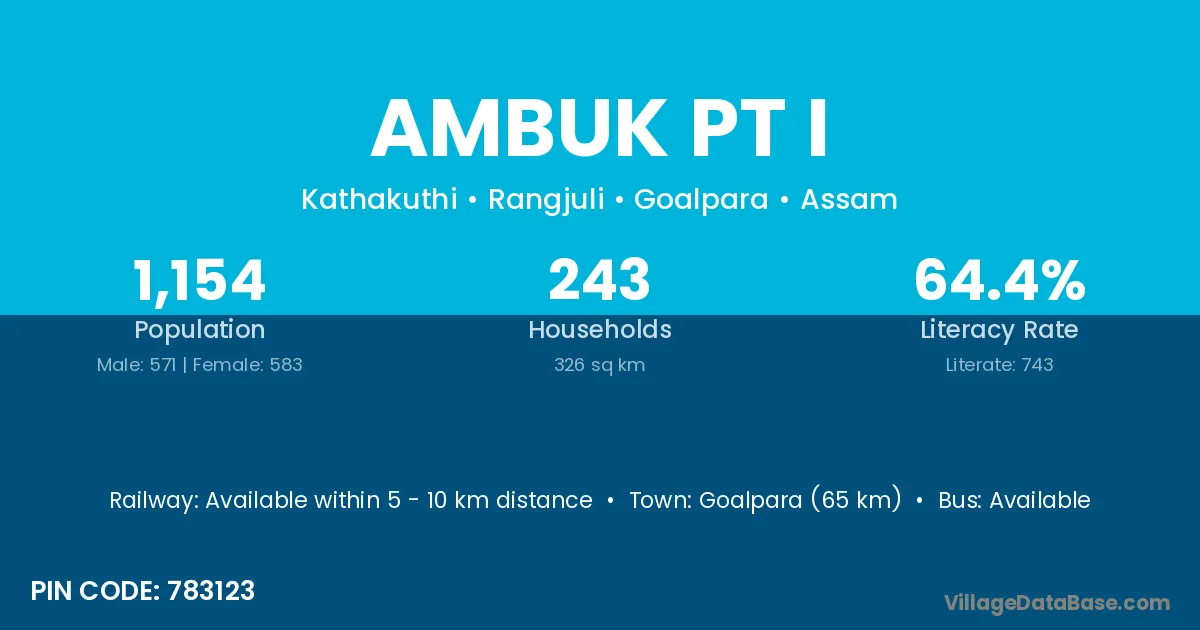 Goalpara (65 km) is the nearest town to Ambuk Pt I village for major economic activities and is located approximately 65 km away.