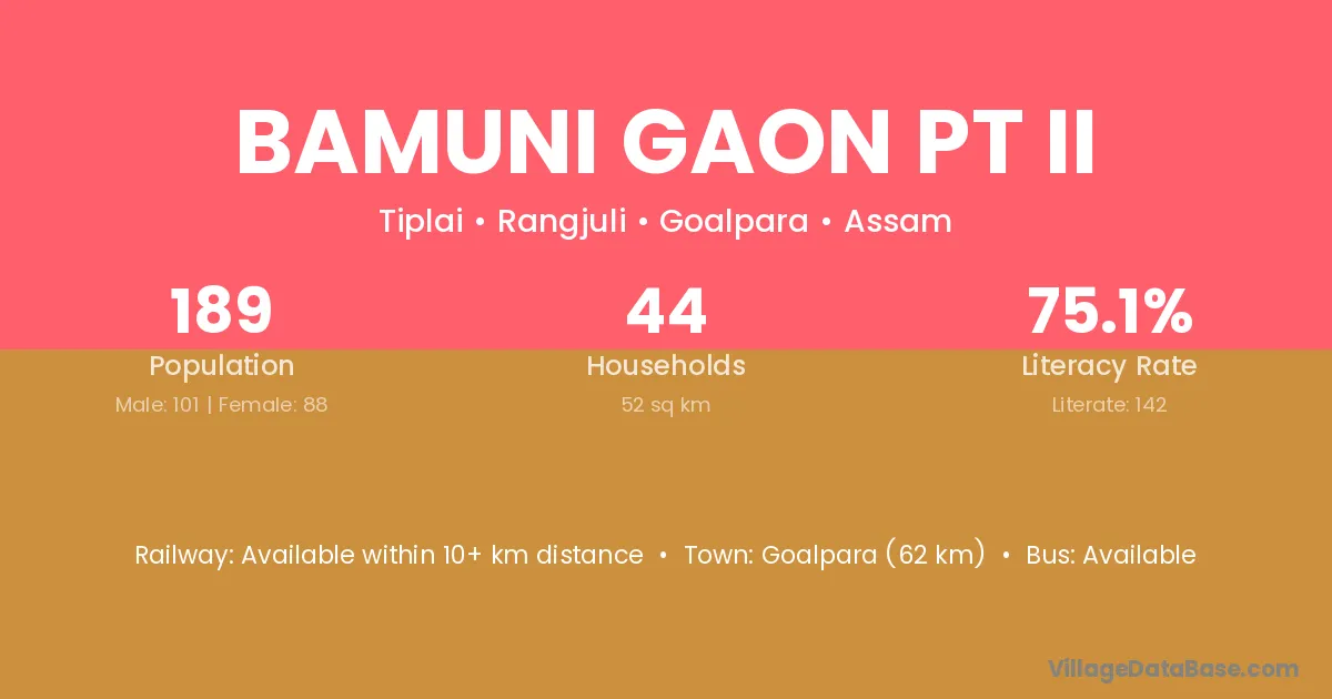 Bamuni Gaon Pt Ii village has a total population of 189 people, of which 101 are males and 88 are females.