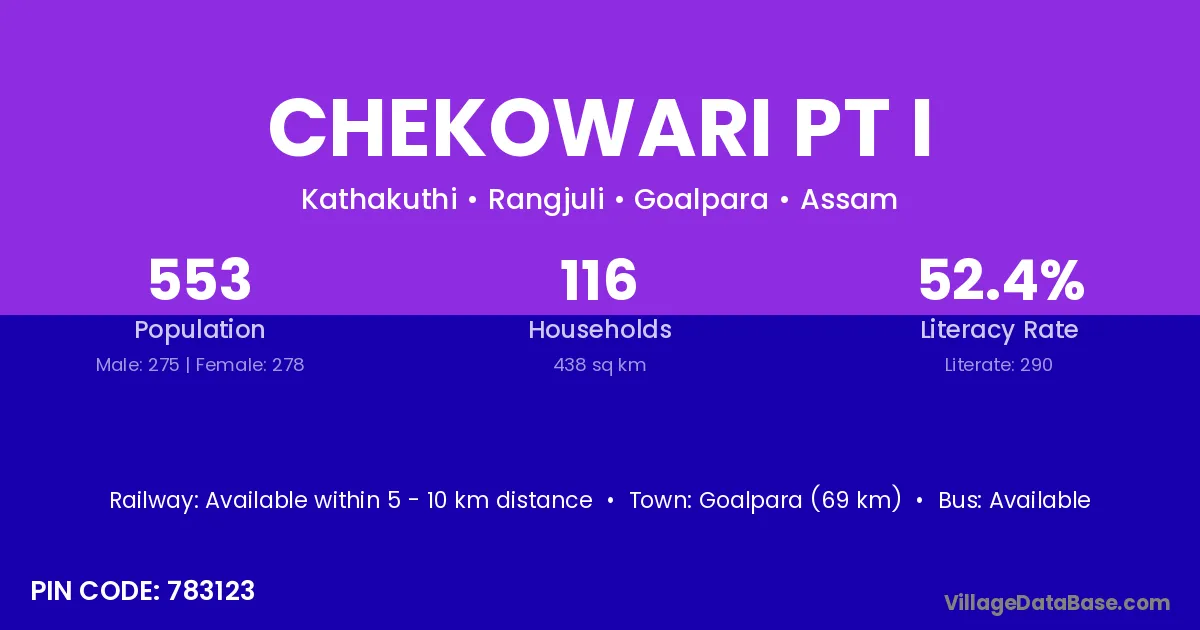 Goalpara (69 km) is the nearest town to Chekowari Pt I village for major economic activities and is located approximately 69 km away.