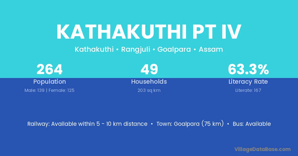 Goalpara (75 km) is the nearest town to Kathakuthi Pt Iv village for major economic activities and is located approximately 75 km away.