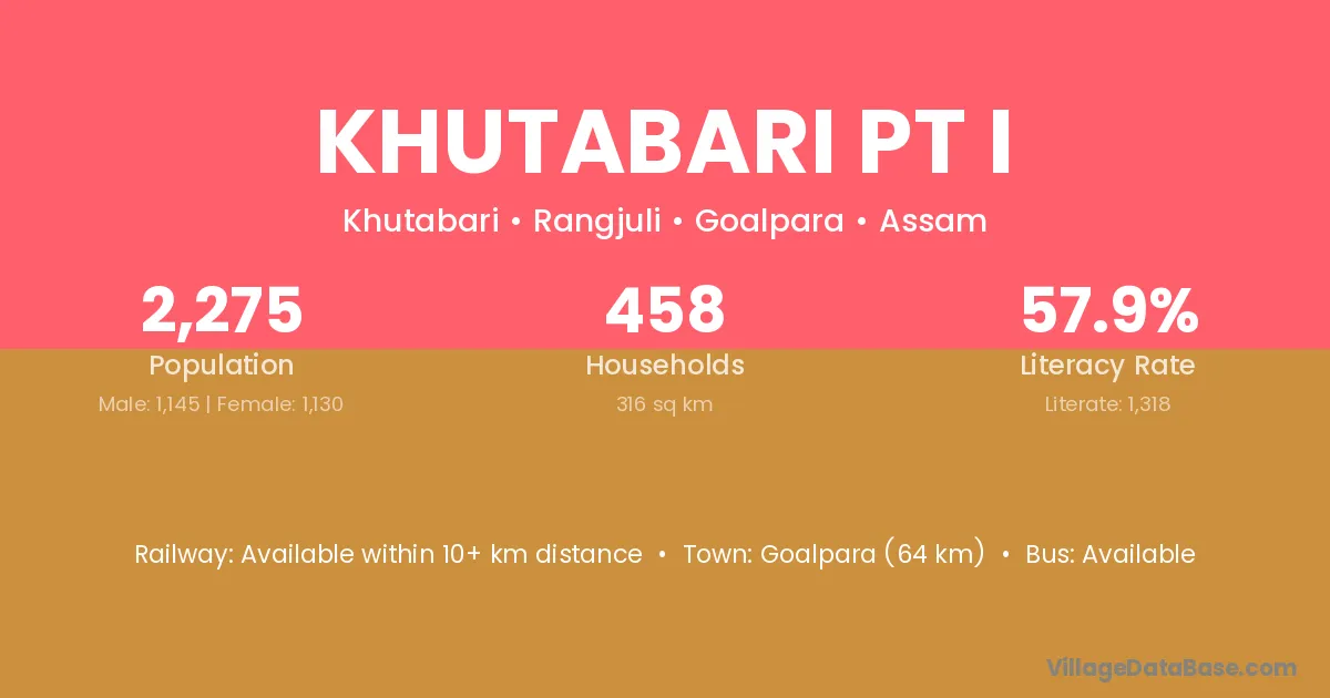 Goalpara (64 km) is the nearest town to Khutabari Pt I village for major economic activities and is located approximately 64 km away.