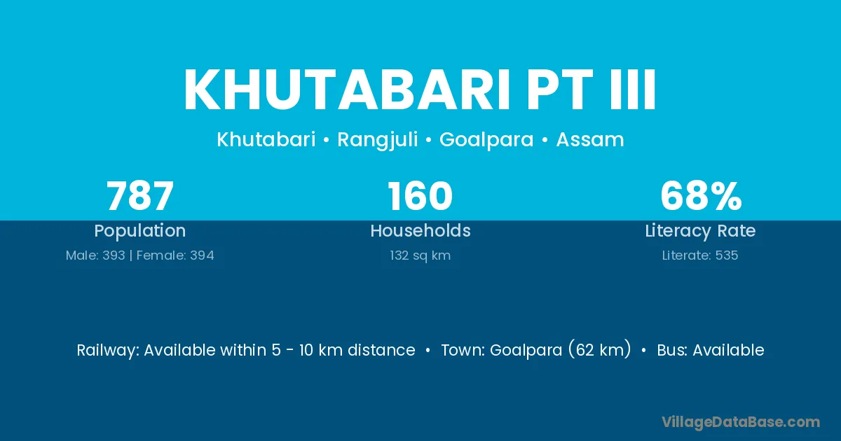 Khutabari Pt Iii village has a total population of 787 people, of which 393 are males and 394 are females.