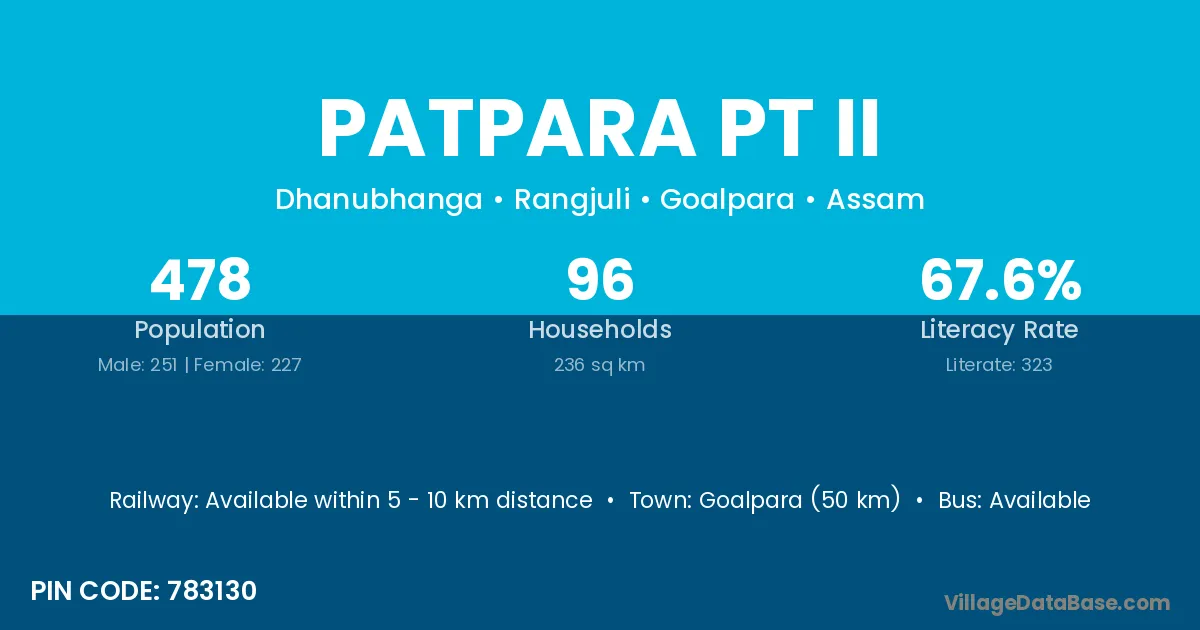 Goalpara (50 km) is the nearest town to Patpara Pt Ii village for major economic activities and is located approximately 50 km away.