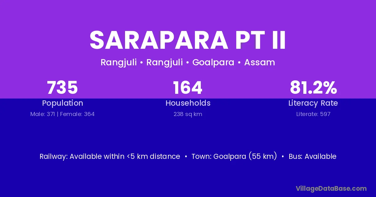 Goalpara (55 km) is the nearest town to Sarapara Pt Ii village for major economic activities and is located approximately 55 km away.