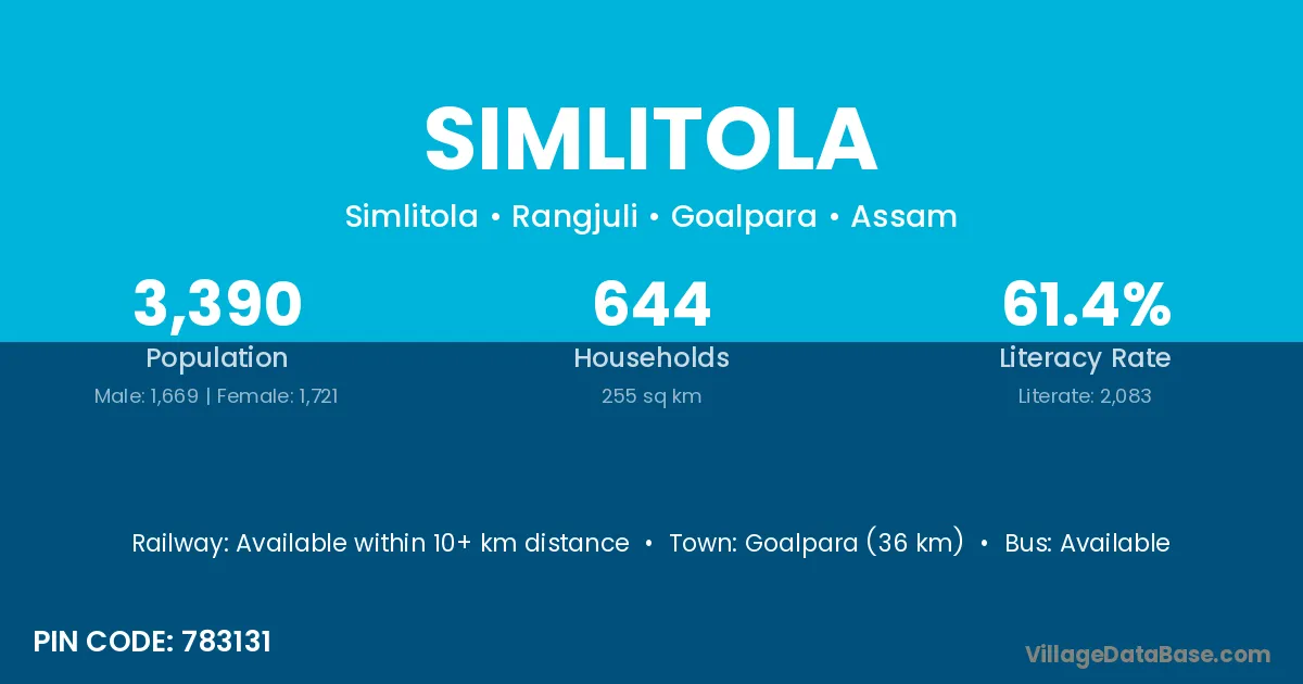 Goalpara (36 km) is the nearest town to Simlitola village for major economic activities and is located approximately 36 km away.