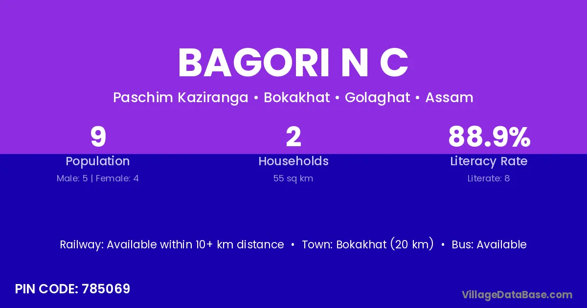Bokakhat (20 km) is the nearest town to Bagori N C village for major economic activities and is located approximately 20 km away.