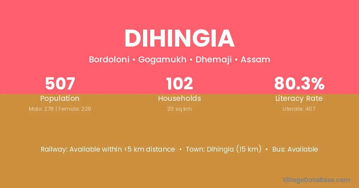 Dihingia village has a total population of 983 people, of which 503 are males and 480 are females.