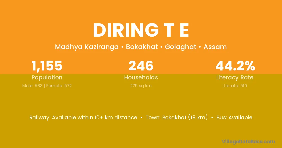 Bokakhat (19 km) is the nearest town to Diring T E village for major economic activities and is located approximately 19 km away.