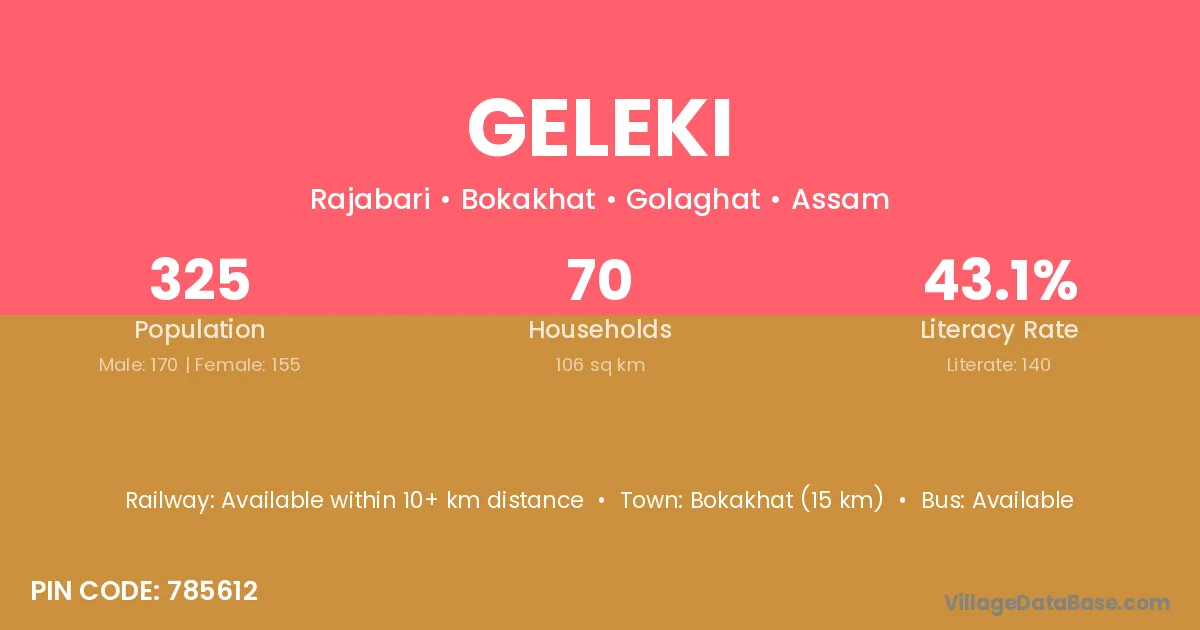 Bokakhat (15 km) is the nearest town to Geleki village for major economic activities and is located approximately 15 km away.