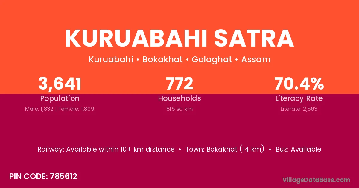 Kuruabahi Satra village has a total population of 3,641 people, of which 1,832 are males and 1,809 are females.