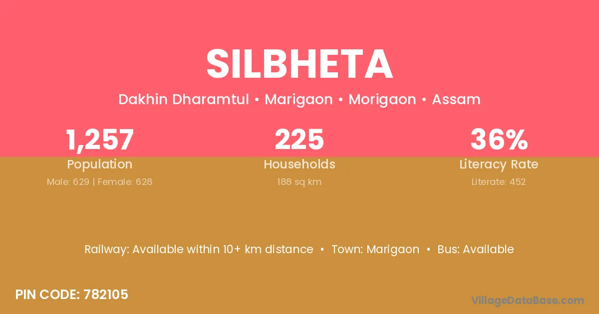 Bokakhat (9 km) is the nearest town to Silbheta village for major economic activities and is located approximately 9 km away.