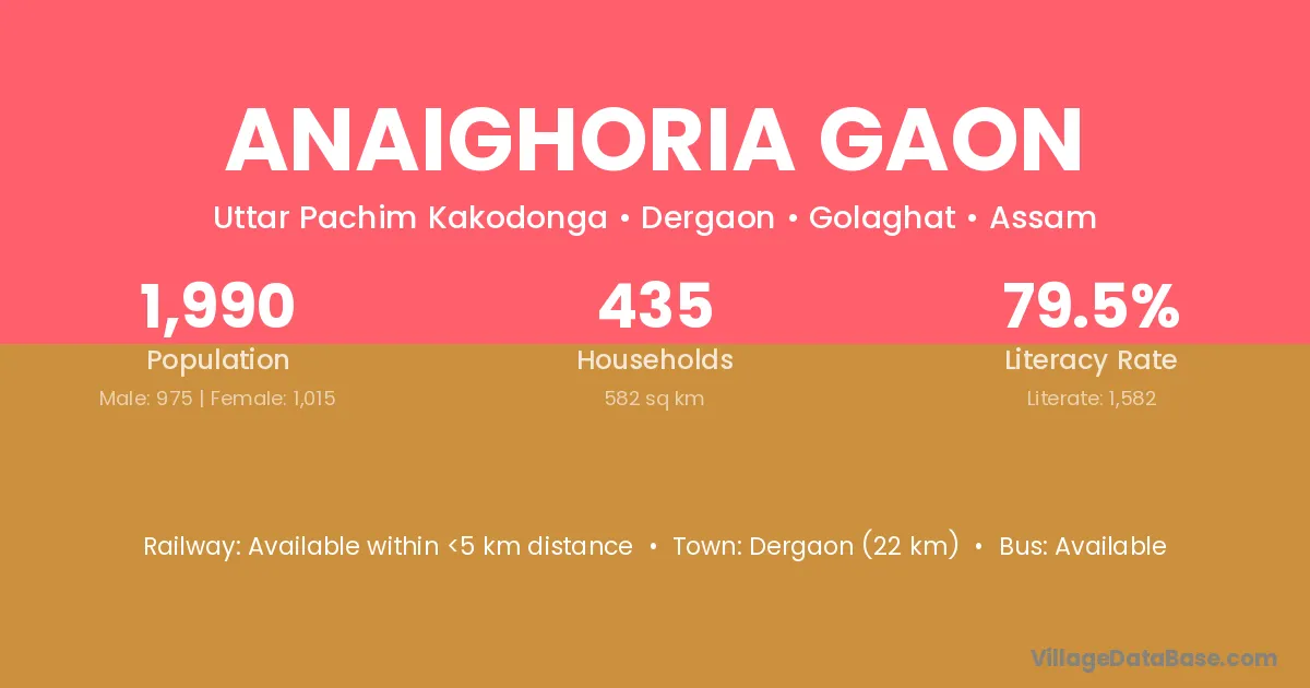 Anaighoria Gaon village has a total population of 1,990 people, of which 975 are males and 1,015 are females.