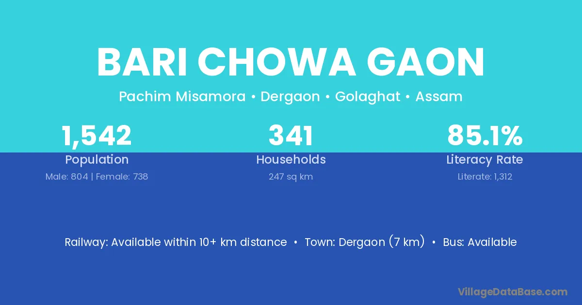Dergaon (7 km) is the nearest town to Bari Chowa Gaon village for major economic activities and is located approximately 7 km away.