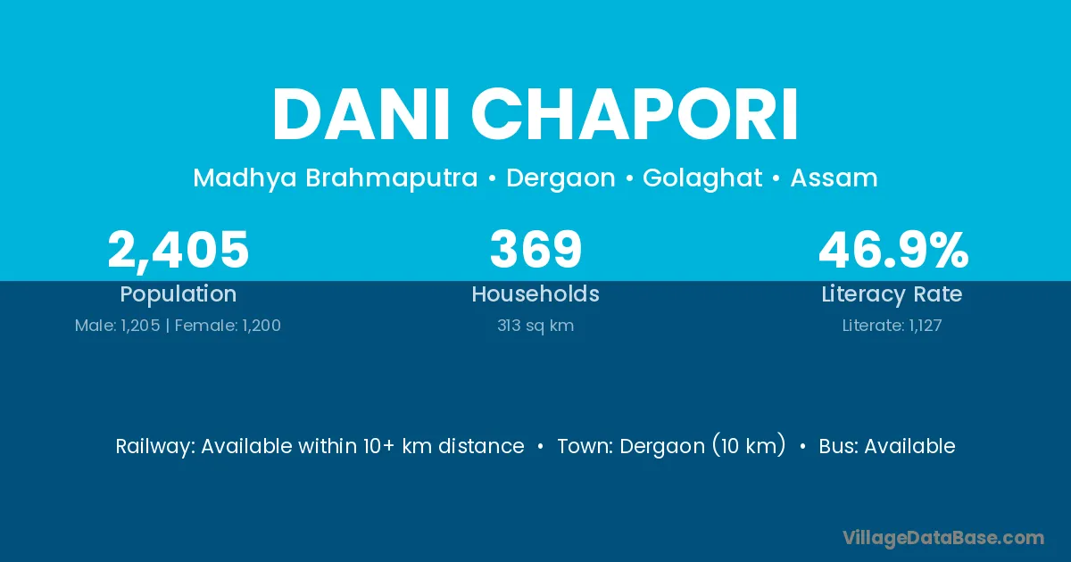 Dani Chapori village has a total population of 2,405 people, of which 1,205 are males and 1,200 are females.