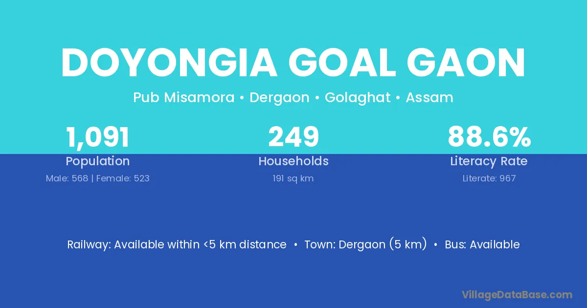 Dergaon (5 km) is the nearest town to Doyongia Goal Gaon village for major economic activities and is located approximately 5 km away.