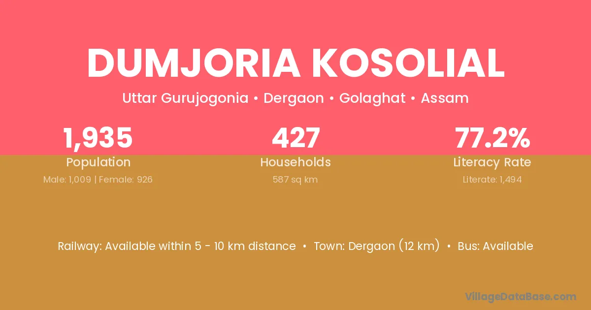 Dergaon (12 km) is the nearest town to Dumjoria Kosolial village for major economic activities and is located approximately 12 km away.