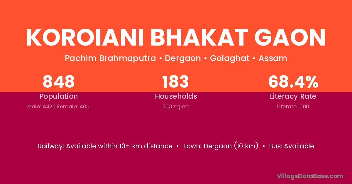 Koroiani Bhakat Gaon village has a total population of 848 people, of which 442 are males and 406 are females.