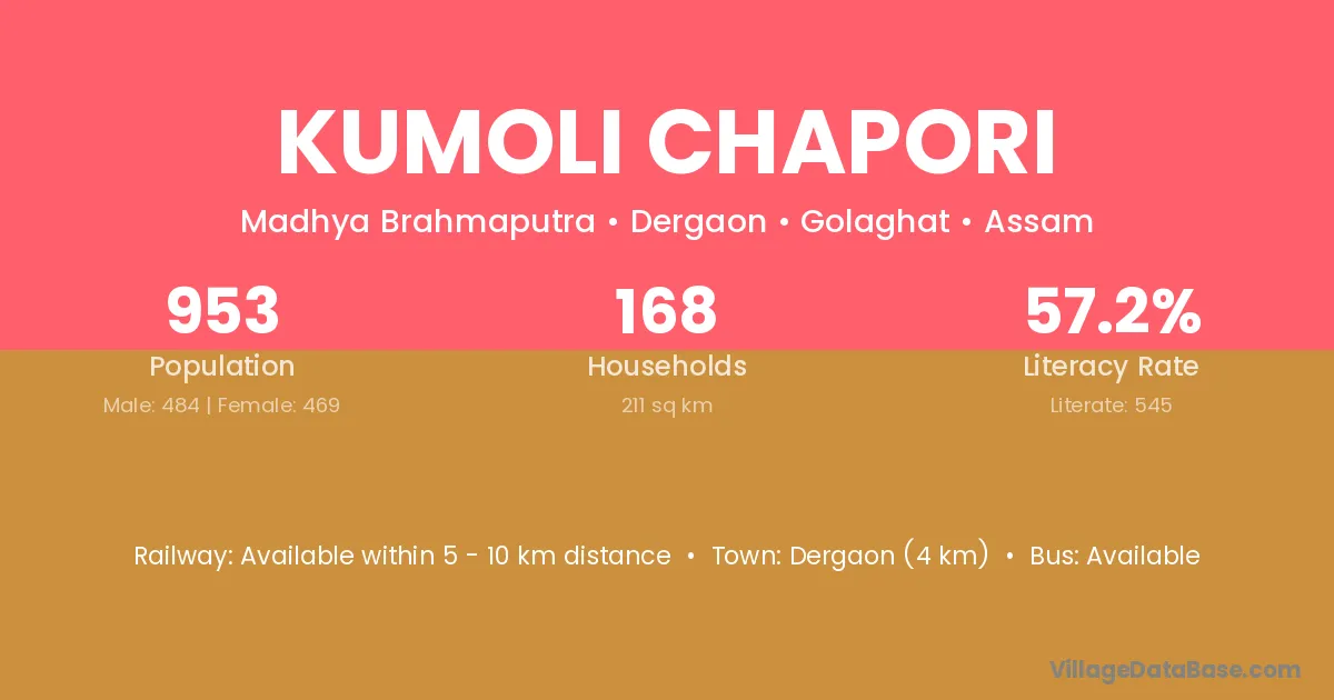 Dergaon (4 km) is the nearest town to Kumoli Chapori village for major economic activities and is located approximately 4 km away.