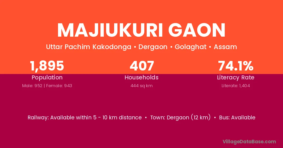 Dergaon (12 km) is the nearest town to Majiukuri Gaon village for major economic activities and is located approximately 12 km away.