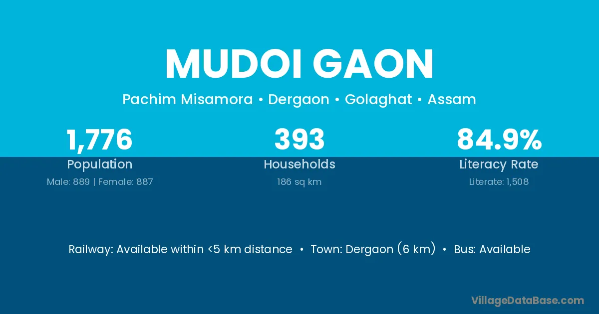 Dergaon (6 km) is the nearest town to Mudoi Gaon village for major economic activities and is located approximately 6 km away.