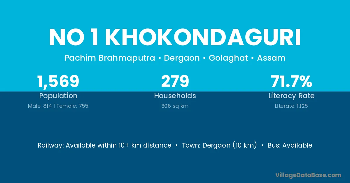 Dergaon (10 km) is the nearest town to No 1 Khokondaguri village for major economic activities and is located approximately 10 km away.