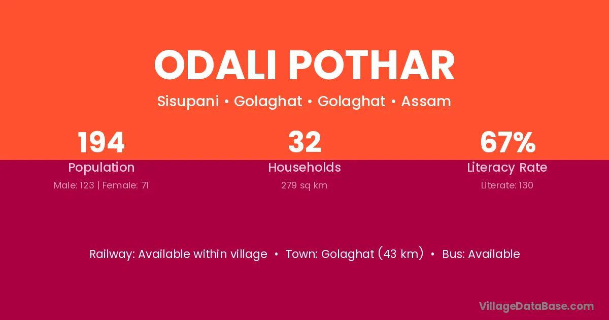 Golaghat (43 km) is the nearest town to Odali Pothar village for major economic activities and is located approximately 43 km away.