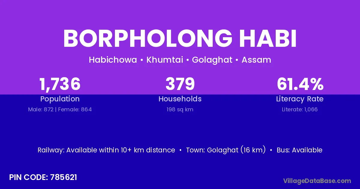 Golaghat (16 km) is the nearest town to Borpholong Habi village for major economic activities and is located approximately 16 km away.